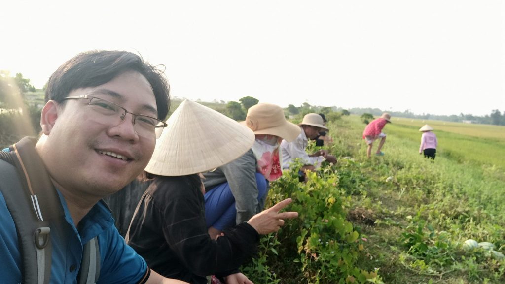 Chiều nay mình lang thang giữa ruộng đồng. Chú Nam chỉ cho mình xa xa những người kia có lẽ đang hái dưa, cháu có thể mua thử, ngon lắm. Mình chạy lại gần hỏi chuyện. Chị Hồng đưa cho mình một trái ăn thử. Thấy mình đang loay hoay, Chị đưa thêm cây kéo cắt dưa để mình bổ ra.